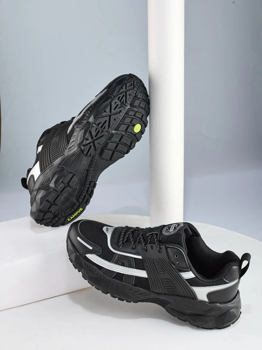 Go bold n' wild with the Campus REPORT Men's Sneakers in Black & Silver. These kicks pair a breezy mesh & sturdy PU upper, topped with a TPU buckle for enhanced stability and movement. The lightweight yet rugged sole teams up with the rubber outsole for reliable all-surface grip. With a cushioned insole that keeps your feet comfy all day, these sneakers are your saviour for everyday statement looks to fun evening outs!